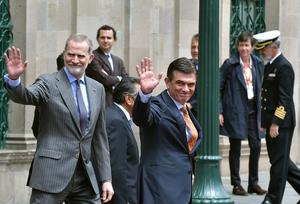 (260312) -- LA PAZ, 12 marzo, 2026 (Xinhua) -- El presidente boliviano, Rodrigo Paz (c), y el rey de España, Felipe VI (i), saludan a los representantes de los medios de comunicación mientras dan un paseo por la Plaza Murillo, en La Paz, Bolivia, el 12 de marzo de 2026. El rey de España, Felipe VI, expresó el jueves su disposición a contribuir a que Bolivia atraiga mayor atención internacional, en respaldo a la estrategia del presidente boliviano, Rodrigo Paz, de proyectar al país hacia nuevos vínculos políticos y económicos con el mundo. (Xinhua/Javier Mamani) (jm) (jg) (ah) (ce)