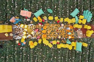 (260312) -- HAIKOU, 12 marzo, 2026 (Xinhua) -- Vista aérea tomada con un dron el 12 de marzo de 2026 de agricultores empacando piñas, en el poblado de Dapo de Haikou, en la provincia de Hainan, en el sur de China. (Xinhua/Guo Cheng) (da) (ra) (ce)