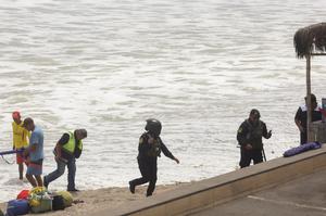 (260314) -- LIMA, 14 marzo, 2026 (Xinhua) - Policías supervisan el cierre de la playa debido a la presencia de oleaje anómalo en la playa San Bartolo, en el sur de Lima, Perú, el 14 de marzo de 2026. (Xinhua/Mariana Bazo) (mb) (rtg) (ra) (da)
