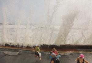 (260314) -- LIMA, 14 marzo, 2026 (Xinhua) – Personas corren a cubrirse mientras las olas golpean en el malecón en la playa San Bartolo, en el sur de Lima, Perú, el 14 de marzo de 2026. (Xinhua/Mariana Bazo) (mb) (rtg) (ra) (da)