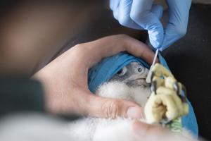 (260314) -- SINGAPUR, 14 marzo, 2026 (Xinhua) -- Trabajadores de la Junta de Parques Nacionales de Singapur (NParks) toman una muestra de ADN del pico de un polluelo de halcón peregrino durante una operación de marcaje y recopilación de datos en el OCBC Center, en Singapur, el 14 de marzo de 2026. El personal de NParks de Singapur colocó anillas a cuatro polluelos de halcón peregrino en el OCBC Center del centro de la ciudad el sábado para rastrear sus movimientos, su esperanza de vida y patrones de reproducción. (Xinhua/Then Chih Wey) (jg) (ra) (da)