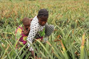 (260316) -- ZE, 16 marzo, 2026 (Xinhua) -- Una agricultora trabaja en un campo de piñas, en la comuna de Zé, una importante zona productora de piña en el sur de Benín, el 16 de marzo de 2026. La piña es uno de los principales productos agrícolas de exportación de Benín, y la variedad cultivada localmente, Sugarloaf, es el primer producto de Benín con indicación geográfica certificada por la Organización Africana de la Propiedad Intelectual. (Xinhua/Seraphin Zounyekpe) (rtg) (vf)