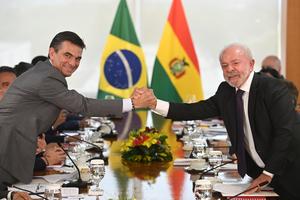 (260316) -- BRASILIA, 16 marzo, 2026 -- El presidente brasileño, Luiz Inácio Lula da Silva (d), estrecha la mano del presidente boliviano, Rodrigo Paz (i), durante una reunión bilateral en el Palacio de Planalto, en Brasilia, Brasil, el 16 de marzo de 2026. Lula da Silva y Paz coincidieron el lunes en la necesidad de profundizar la integración regional para hacer frente al desafiante escenario internacional. (Xinhua/Lucio Tavora) (lt) (rtg) (ah) (ce)