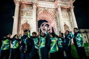 (260316) -- MILAN, 16 marzo, 2026 (Xinhua) -- Imagen del 15 de marzo de 2026 de voluntarios posando para una fotografía frente al Arco della Pace, previo a que se apagara el pebetero en Milán, Italia. La ceremonia de clausura de los Juegos Paralímpicos de Invierno Milán-Cortina 2026 se llevó a cabo en Cortina D'ampezzo, Italia, el domingo. (Xinhua) (ah) (rtg) (ce)