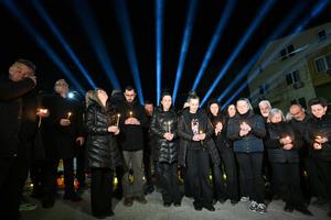 (260316) -- KOCANI, 16 marzo, 2026 (Xinhua) -- Personas se lamentan durante una conmemoración que marca el primer aniversario de un incendio en una discoteca, en Kocani, Macedonia del Norte, el 16 de marzo de 2026. El 16 de marzo de 2025 un incendio en una discoteca cobró las vidas de 63 individuos e hirió a más de 100. (Xinhua/Tomislav Georgiev) (rtg) (ah) (vf)