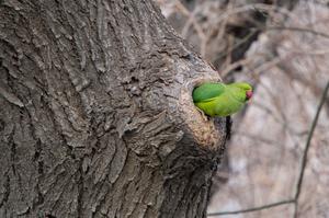 (260317) -- BAKU, 17 marzo, 2026 (Xinhua) -- Imagen del 16 de marzo de 2026 de una cotorra de Kramer vista en el hueco de un árbol en el Bulevar Costero, en Bakú, Azerbaiyán. (Xinhua/Chen Junfeng) (jg) (ra) (ce)