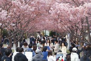 (260318) -- BEIJING, 18 marzo, 2026 (Xinhua) -- Imagen del 16 de marzo de 2026 de personas observando las flores de cerezo, en el distrito de Yinzhou de Ningbo, en la provincia de Zhejiang, en el este de China. (Xinhua/Hu Jiajie) (ah) (ra) (ce)