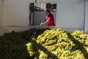 (260319) -- COQUIMBO, 19 marzo, 2026 (Xinhua) -- Imagen cedida por la Fundación Imagen de Chile del 24 de febrero de 2026 de un operario de la destilería Fundo Los Nichos paleando uvas verdes a una máquina que separa el mosto, el palillo y la cáscara, durante la temporada de vendimia, en el Valle del Elqui, en la región de Coquimbo, en el norte de Chile. La vendimia en el caluroso norte chileno tiene a los campesinos de los valles andinos atareados con la cosecha y molienda de las jugosas y aromáticas uvas verdes, la materia prima del pisco, el destilado más popular en el país sudamericano. (Xinhua/Fundación Imagen de Chile) (da) (ra) (vf)