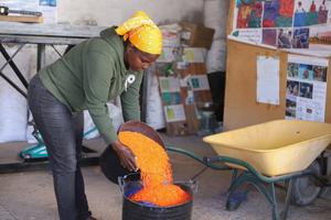 (260320) -- PRAIA, 20 marzo, 2026 (Xinhua) -- Imagen del 19 de marzo de 2026 de una trabajadora procesando plástico reciclado para convertirlo en gránulos, en preparación de los materiales para la siguiente etapa de prensado en caliente, en una microempresa comunitaria, en Praia, Cabo Verde. En las afueras de Praia, una microempresa comunitaria comprometida con la protección del medio ambiente y el reciclaje se dedica a transformar plástico y vidrio desechados en pupitres, sillas y otros artículos útiles para las escuelas. (Xinhua/Elton Monteiro) (jg) (da) (ce)