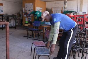 (260320) -- PRAIA, 20 marzo, 2026 (Xinhua) -- Imagen del 19 de marzo de 2026 de un trabajador colocando sillas para estudiantes, restauradas con materiales reciclados, en una microempresa comunitaria, en Praia, Cabo Verde. En las afueras de Praia, una microempresa comunitaria comprometida con la protección del medio ambiente y el reciclaje se dedica a transformar plástico y vidrio desechados en pupitres, sillas y otros artículos útiles para las escuelas. (Xinhua/Elton Monteiro) (jg) (da) (ce)