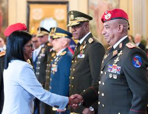 (260320) -- CARACAS, 20 marzo, 2026 (Xinhua) -- Imagen proveída por la Presidencia de Venezuela del 19 de marzo de 2026 de la presidenta encargada venezolana, Delcy Rodríguez (i), estrechando la mano del nuevo comandante de la Guardia de Honor Presidencial, Henry Navas Rumbos (d), en el Palacio de Miraflores, en Caracas, Venezuela. Rodríguez anunció en la noche del jueves que ha designado un alto mando militar "renovado" con el objetivo de preservar la soberanía de la nación sudamericana bajo el mando de la gobernante y el del nuevo ministro de Defensa, Gustavo González López. (Xinhua/Presidencia de Venezuela) (ms) (jg) (da) (ce)
