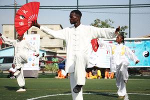 (260322) -- GODOMEY, 22 marzo, 2026 (Xinhua) -- Imagen del 21 de marzo de 2026 de entusiastas realizando una presentación de Taijiquan, un tipo de arte marcial tradicional chino, en Godomey, Benin. Demostraciones y actividades de iniciación se llevaron a cabo el sábado aquí para celebrar el primer Día Internacional del Taijiquan. (Xinhua/Seraphin Zounyekpe) (ah) (da)