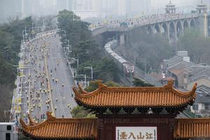 (260322) -- WUHAN, March 22, 2026 (Xinhua) -- Participantes corren frente a la emblemática Huanghelou, o Torre de la Grulla Amarilla, durante el Maratón de Wuhan del Banco de China 2026, en Wuhan, en la provincia de Hubei, en el centro de China, el 22 de marzo de 2026. (Xinhua/Wu Zhizun) (da) (ah)