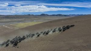 (260321) -- LHASA, 21 marzo, 2026 (Xinhua) -- Vista aérea tomada con un dron el 10 de marzo de 2026 de una manada de yaks salvajes corriendo cerca del glaciar Zangser Kangri en la Reserva Natural Nacional de Changtang, en la región autónoma de Xizang, en el suroeste de China. El 21 de marzo se conmemora el Día Mundial de los Glaciares. (Xinhua/Sonam Jamcan) (jg) (da)