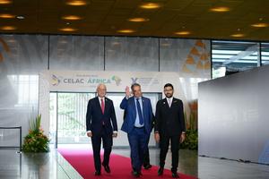 (260321) -- BOGOTA, 21 marzo, 2026 (Xinhua) -- El presidente de Uruguay, Yamandú Orsi (c), saluda durante su llegada al Foro de Alto Nivel CELAC-Africa Colombia 2026 en el Centro de Convenciones Agora Bogotá, en Bogotá, capital de Colombia, el 21 de marzo de 2026. (Xinhua/Andrés Moreno) (am) (jg) (da)