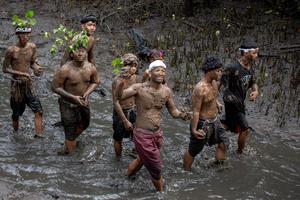 (260321) -- BALI, 21 marzo, 2026 (Xinhua) -- Imagen del 20 de marzo de 2026 de balineses cubriendose el cuerpo con barro mientras participan en la tradición del baño de barro, conocida como Mebuug-buugan, en la aldea de Kedonganan, en la regencia de Badung, Bali, Indonesia. El Mebuug-buugan se celebra un día después de Nyepi con el objetivo de neutralizar las energías negativas. (Xinhua/Lana Priatna) (jg) (da)