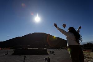 (260321) -- TEOTIHUACAN, 21 marzo, 2026 (Xinhua) -- Una persona recibe los rayos del sol frente a la Pirámide del Sol en el marco del equinoccio de primavera, en la zona arqueológica de Teotihuacán, en Teotihuacán, México, el 21 de marzo de 2026. (Xinhua/Francisco Cañedo) (fc) (rtg) (da)