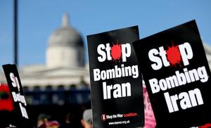 (260322) -- LONDRES, 22 marzo, 2026 (Xinhua) -- Imagen del 21 de marzo de 2026 de personas sosteniendo letreros frente a la Plaza Trafalgar durante una protesta en contra de los ataques estadounidenses e israelíes en Irán, en el centro de Londres, Reino Unido. (Xinhua/Li Ying) (rtg) (ah)