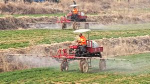 (260323) -- JINAN, 23 marzo, 2026 (Xinhua) -- Agricultores aplican fertilizantes y realizan control de plagas y enfermedades en los cultivos de trigo, en el poblado de Hushan, en la ciudad de Rongcheng, en la provincia de Shandong, en el este de China, el 23 de marzo de 2026. Después del equinoccio de primavera, los agricultores de Shandong han aprovechado la temporada agrícola para llevar a cabo la labranza de primavera. (Xinhua/Li Xinjun) (rtg) (ah) (vf)