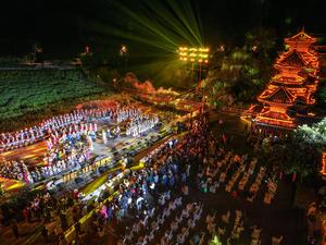 (260324) -- LIPING, 24 marzo, 2026 (Xinhua) -- Vista aérea tomada con un dron el 23 de marzo de 2026 de una gala de intercambio cultural, en la aldea dong de Zhaoxing, en el distrito de Liping, en la provincia de Guizhou, en el suroeste de China. El coro a capela The Whiffenpoofs de la Universidad de Yale visitó el distrito de Liping, en la provincia de Guizhou, en el suroeste de China, del 23 al 24 de marzo para participar en actividades de intercambio cultural. (Xinhua/Yang Wenbin) (oa) (ah) (vf)