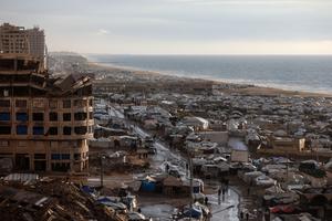 (260325) -- CIUDAD DE GAZA, 25 marzo, 2026 (Xinhua) -- Imagen del 25 de marzo de 2026 de las tiendas de campaña temporales para palestinos desplazados, en el oeste de la Ciudad de Gaza. (Xinhua/Rizek Abdeljawad) (jg) (da) (vf)