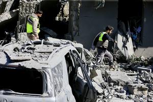 (260328) -- SAKSAKIYEH, 28 marzo, 2026 (Xinhua) -- Imagen del 27 de marzo de 2026 de rescatistas inspeccionando edificios y vehículos destruidos por los ataques aéreos israelíes, en Saksakiyeh, Líbano. Al menos 11 personas murieron el viernes en los ataques aéreos israelíes sobre el sur y el este de Líbano y los suburbios del sur de Beirut, según la oficial Agencia Nacional de Noticias de Líbano. (Xinhua/Ali Hashisho) (oa) (da)