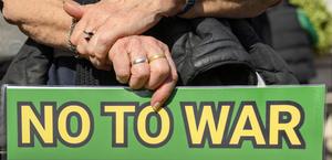 (260329) -- LONDRES, 29 marzo, 2026 (Xinhua) -- Imagen del 28 de marzo de 2026 de una manifestante sosteniendo una pancarta que condena los ataques de Estados Unidos e Israel contra Irán, en el centro de Londres, Reino Unido. (Xinhua/Ray Tang) (oa) (ah)