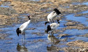 (260330) -- HONGYUAN, 30 marzo, 2026 (Xinhua) -- Imagen del 29 de marzo de 2026 de una bandada de grullas de cuello negro alimentándose en un río, en el distrito de Hongyuan, en la provincia de Sichuan, en el suroeste de China. (Xinhua/Xie Hongcheng) (rtg) (ah) (ce)