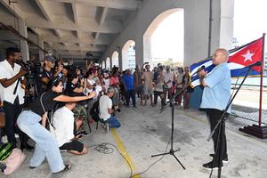 (260329) -- LA HABANA, 29 marzo, 2026 (Xinhua) -- Imagen del 28 de marzo de 2026 del coordinador nacional de los Comités de Defensa de la Revolución de Cuba, Gerardo Hernández (d), hablando durante un acto de recibimiento para los tripulantes de los dos veleros del Convoy Nuestra América, procedentes de México con ayuda humanitaria, en La Habana, capital de Cuba. Dos veleros del Convoy Nuestra América, procedentes de México, arribaron el sábado a la bahía de La Habana, luego de varios días sin comunicación con autoridades marítimas. (Xinhua/Joaquín Hernández) (jh) (rtg) (ah)