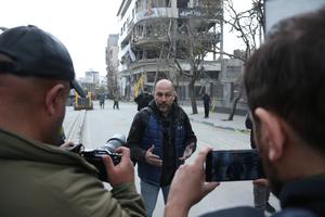 (260330) -- TEHERAN, 30 marzo, 2026 (Xinhua) -- Imagen del 29 de marzo de 2026 de un periodista de la cadena de televisión qatarí Al Araby hablando con representantes de los medios de comunicación, frente al edificio que alberga las oficinas de la cadena, después de un ataque con misiles, en Teherán, Irán. La cadena de televisión qatarí Al Araby dijo el domingo que sus oficinas en Teherán fueron dañadas por un ataque aéreo israelí. (Xinhua/Shadati) (rtg) (ah) (ce)