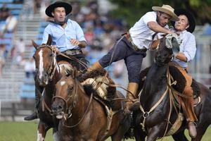 (260330) -- MONTEVIDEO, 30 marzo, 2026 (Xinhua) -- Gauchos participan en las jineteadas durante la 99 edición de la Semana Criolla del Prado, en el rodeo de la Rural del Prado, en Montevideo, capital de Uruguay, el 30 de marzo de 2026. (Xinhua/Nicolás Celaya) (nc) (oa) (ah) (vf)
