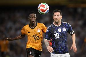 (260401) -- BUENOS AIRES, 1 abril, 2026 (Xinhua) -- Imagen del 31 de marzo de 2026 del jugador, Lionel Messi (d), de Argentina, disputando el balón con Given Kalusa (i), de Zambia, durante el partido amistoso internacional previo a la Copa Mundial de la FIFA 2026, celebrado en el Estadio Alberto J. Armando, en la ciudad de Buenos Aires, capital de Argentina. (Xinhua/Martín Zabala) (mz) (ah) (ra) (ce)