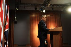 (260401) -- LONDRES, 1 abril, 2026 (Xinhua) -- El primer ministro británico, Keir Starmer, habla en una conferencia de prensa, en Londres, Reino Unido, el 1 de abril de 2026. El primer ministro británico, Keir Starmer, dijo el miércoles que Reino Unido organizará una cumbre internacional esta semana sobre el restablecimiento de la libertad de navegación en el Estrecho de Ormuz. (Xinhua/Simon Dawson/Número 10 de Downing Street) (ah) (ra) (ce)