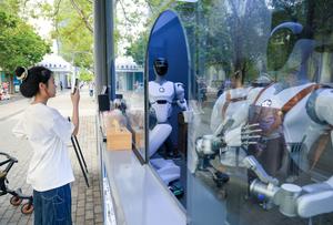 (260402) -- SHENZHEN, 2 abril, 2026 (Xinhua) -- Imagen del 1 de abril de 2026 de robots preparando bebidas para una turista en un parque de talento de Shenzhen, en Shenzhen, en la provincia de Guangdong, en el sur de China. En los últimos años, Shenzhen ha enriquecido la experiencia de los ciudadanos en los parques al añadir diversas funciones a los parques tradicionales. (Xinhua/Mao Siqian) (rtg) (ra) (ce)