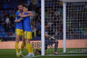 (260401) -- VALENCIA, 1 abril, 2026 (Xinhua) -- Imagen del 31 de marzo de 2026 de Oleksiy Hutsulyak (d), de Ucrania, festejando su anotación con su compañero durante el partido amistoso internacional de fútbol entre Ucrania y Albania, en Valencia, España. (Xinhua) (ah) (ra) (ce)