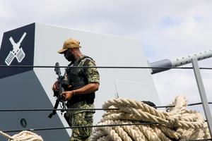 (260401) -- CIUDAD DE PANAMA, 1 abril, 2026 (Xinhua) -- Imagen del 29 de marzo del 2026 de un soldado montando guardia durante la llegada del destructor USS Gridley de la Armada de Estados Unidos a puerto como parte del despliegue por el continente "Southern Seas 2026" junto al portaaviones USS Nimitz en la Terminal de Cruceros de Amador, en la Ciudad de Panamá, capital de Panamá. (Xinhua/Daniel González) (dg) (jg) (da) (vf)