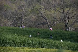 (260403) -- XUANCHENG, 3 abril, 2026 (Xinhua) -- Imagen del 2 de abril de 2026 de trabajadores recolectando hojas de té al pie de la montaña Jingting, en la ciudad de Xuancheng, en la provincia de Anhui, en el este de China. Como una principal zona de producción de té verde, la montaña está rodeada por más de 10.000 mu (aproximadamente 666,67 hectáreas) de jardines de té. (Xinhua/Zhang Duan) (rtg) (ra) (vf)