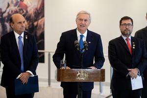 (260406) -- BUENOS AIRES, 6 abril, 2026 (Xinhua) -- El presidente chileno, José Antonio Kast (c), habla junto al ministro de Relaciones Exteriores chileno, Francisco Pérez Mackenna (d), y al embajador de Chile en Argentina, Gonzalo Uriarte Herrera (i), durante una conferencia de prensa en la sede de la Embajada de Chile en Argentina, en la ciudad de Buenos Aires, capital de Argentina, el 6 de abril de 2026. El presidente de Argentina, Javier Milei, recibió el lunes en la Casa de Gobierno a su homólogo de Chile, José Antonio Kast, con objeto de establecer las prioridades de la relación bilateral. (Xinhua/Martín Zabala) (mz) (rtg) (ah) (vf)