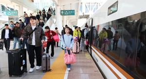 (260406) -- BEIJING, 6 abril, 2026 (Xinhua) -- Pasajeros caminan para abordar el tren en la Estación de Ferrocarril de Lianyungang, en la ciudad de Lianyungang, en la provincia de Jiangsu, en el este de China, el 6 de abril de 2026. Un estimado de 845,38 millones de viajes de pasajeros tuvieron lugar en toda China durante las vacaciones de tres días del Festival Qingming, lo que representa un aumento interanual del 6 por ciento, informaron el lunes las autoridades de transporte. (Xinhua/Geng Yuhe) (rtg) (ah) (ce)
