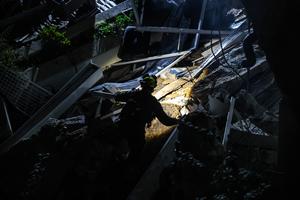 (260406) -- HAIFA, 6 abril, 2026 (Xinhua) -- Imagen del 5 de abril de 2026 de un rescatista visto en el sitio de un ataque con misil iraní, en Haifa, en el norte de Israel. Cuatro personas están desaparecidas y cuatro más resultaron heridas después de que un misil iraní impactó un edificio residencial, en Haifa, una ciudad en el norte de Israel, dijo la policía el domingo. (Xinhua/JINI) (rtg) (ah) (ce)