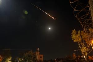 (260407) -- HEBRON, 7 abril, 2026 (Xinhua) -- Una estela dejada por un proyectil en el cielo, en medio de tensiones regionales, es vista desde la ciudad de Hebrón, en Cisjordania, el 7 de abril de 2026. (Xinhua/Mamoun Wazwaz) (oa) (ah) (ce)