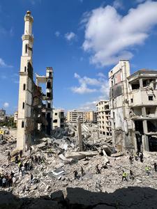 (260408) -- SIDON, 8 abril, 2026 (Xinhua) -- Rescatistas inspeccionan los escombros de edificios destruidos en el sitio de un ataque aéreo israelí, en la ciudad de Sidón, en el sur de Líbano, el 8 de abril de 2026. Hasta ahora, la ofensiva israelí en todo Líbano ha causado la muerte de al menos 254 personas y ha dejado a otras 1.165 heridas. Los vecindarios densamente poblados de la capital, Beirut, se encuentran entre los más afectados, de acuerdo con los últimos datos proporcionados por la Defensa Civil libanesa. (Xinhua/Ali Hashisho) (da) (vf)