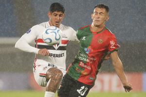 (260408) -- MONTEVIDEO, 8 abril, 2026 (Xinhua) -- Imagen del 7 de abril de 2026 del jugador, Agustín Amado (d), de Boston River, de Uruguay, disputando el balón con Alan Franco (i), de Sao Paulo, de Brasil, durante el partido del grupo C de la jornada 1 de la fase de grupos de la Copa Conmebol Sudamericana, celebrado en el Estadio Centenario, en Montevideo, capital de Uruguay. (Xinhua/Nicolás Celaya) (nc) (ah) (ra) (ce)