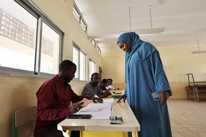 (260410) -- CIUDAD DE YIBUTI, 10 abril, 2026 (Xinhua) -- Una mujer se registra antes de emitir su voto en un colegio electoral para las elecciones presidenciales, en la Ciudad de Yibuti, capital de Yibuti, el 10 de abril de 2026. Los centros de votación abrieron sus puertas en todo Yibuti el viernes por la mañana para dar inicio a la votación en las elecciones presidenciales del país. En estas elecciones se verá al presidente en funciones, Ismail Omar Guelleh, de 78 años, postularse para su sexto mandato y competir contra Mohamed Farah Samatar, candidato presidencial del Centro Democrático Unificado. (Xinhua/Geng Xinning) (jg) (da) (vf)