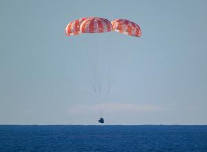 (260411) -- SAN DIEGO, 11 abril, 2026 (Xinhua) -- Imagen del 10 de abril de 2026 de la nave espacial Orión de la Administración Nacional de Aeronáutica y del Espacio de Estados Unidos (NASA) que transporta a los miembros de la tripulación de la Artemis II vista mientras ameriza en el océano Pacífico frente a la costa de California, Estados Unidos. La cápsula de la misión Artemis II de la NASA amerizó el viernes por la tarde frente a la costa de San Diego, California, Estados Unidos. (Xinhua/Bill Ingalls/NASA) (rtg) (da)