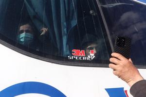 (260412) -- HASAKAH, 12 abril, 2026 (Xinhua) -- Imagen del 11 de abril de 2026 de una persona sosteniendo un teléfono móvil mientras comprueba información con los detenidos liberados sentados dentro de un autobús durante un intercambio de prisioneros entre la autoridad interina siria y las Fuerzas Democráticas Sirias de liderazgo kurdo, en Hasakah, Siria. Un nuevo grupo de detenidos fue liberado el sábado en la ciudad nororiental de Hasakah como parte de un intercambio de prisioneros en curso. (Xinhua/Str) (oa) (da)