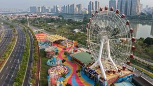 (260413) -- ZHANGZHOU, 13 abril, 2026 (Xinhua) -- Vista aérea tomada con un dron el 12 de abril de 2026 de atracciones en la zona turística "Long Jiang Years", en la ciudad de Zhangzhou, en la provincia de Fujian, en el sureste de China. En años recientes, el Gobierno de Zhangzhou ha reforzado la protección ecológica e impulsado la conservación y restauración de áreas clave como la cuenca del río Jiulong para mantener cielos azules, suelos limpios y aguas cristalinas. (Xinhua/Deng Hua) (rtg) (ah) (vf)
