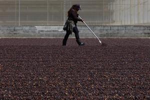 (260413) -- SONSONATE, 13 abril, 2026 (Xinhua) -- Imagen del 29 de marzo de 2026 de una mujer trabajando en los patios de secado de granos de café, durante una cata y muestra de grano de café en el beneficio "Los Naranjos", en la municipalidad de Juayúa, en el departamento de Sonsonate, El Salvador. El salvadoreño, Hebert Vásquez, y su esposa, la empresaria china, Tong Taohui, han construido en los últimos años un puente comercial que ahora da un nuevo salto: tras posicionar el café salvadoreño en el mercado chino han creado una empresa para introducir tecnología china especializada en la industria cafetalera y proyectarse hacia Centroamérica. (Xinhua/Alexander Peña) (ap) (rtg) (ah) (ce)