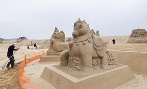 (260414) -- ZHOUSHAN, 14 abril, 2026 (Xinhua) -- Imagen del 14 de abril de 2026 de esculturas de arena parcialmente terminadas en el área escénica de Nansha, en Zhujiajian, en la ciudad de Zhoushan, en la provincia de Zhejiang, en el este de China. Los preparativos para la exposición de esculturas de arena de Zhoushan 2026 avanzan sin contratiempos. Con una superficie total de 10.000 metros cuadrados en el área escénica de Nansha en Zhujiajian, la exposición tiene previsto mostrar más de 50 esculturas de arena con temática ecuestre. Se espera que abra oficialmente al público a principios de mayo. (Xinhua/Xu Yu) (jg) (ra) (vf)