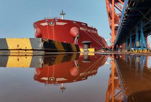 (260415) -- SHIJIAZHUANG, 15 abril, 2026 (Xinhua) -- Imagen tomada con un dron el 15 de abril de 2026 de trabajadores preparando un barco para su partida de la terminal de minerales del Area Portuaria de Caofeidian en el Puerto de Tangshan, en Tangshan, en la provincia de Hebei, en el norte de China. De enero a marzo de este año, el Area Portuaria de Caofeidian manejó un volumen de carga de 138,03 millones de toneladas, lo que supone un aumento interanual del 3,16 por ciento. (Xinhua/Yang Shiyao) (ah) (ra) (vf)